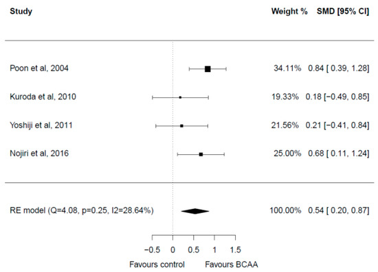 BCAA supplementation consisted of BCAA granules (LIVACT granules, Ajinomoto Pharmaceuticals, Tokyo Japan) in 7 studies [24,30,31,34,36,37,38] and of BCAA-enriched nutrient (Aminoleban EN, Otsuka Pharmaceuticals, Tokyo, Japan) in 7 studies [23,25,28,29,32,33,35]. Two studies used both [26,27] (Table 3).