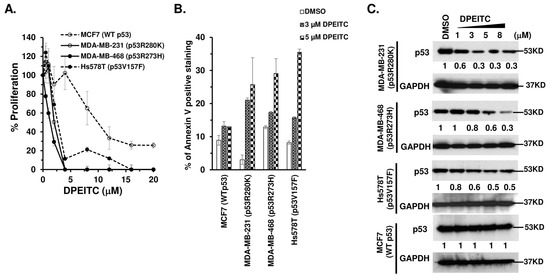 In this study, we demonstrate that DPEITC can inhibit the proliferation of TNBC cells expressing different p53 mutant types, contact (p53R280K MDA-MB-231 and p53R273H MDA-MB-468) and structural (p53V157F Hs578T). Of note, the IC50 values for DPEITC (with two aromatic rings) are significantly lower than that of PEITC (one aromatic ring) for p53R280K MDA-MB-231 and p53R273H MDA-MB-468 cell lines, as shown previously [27] and for p53V157F Hs578T in the present study. These results showed that DPEITC is a more potent inhibitor of proliferation. Previous studies showed that the lipophilicity of the side chain moiety of aromatic ITCs is a crucial determinant of their apoptotic potential [22]. DPEITC inhibited the proliferation of WT p53 MCF7 cells; however, it induced apoptosis selectively in mutant p53 TNBC cells and depleted mutant p53, but not WT. Collectively, these results showed that mutant p53 TNBC cells were more sensitive and supported mutant p53 as a target of DPEITC.