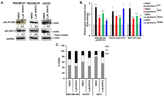 Because WT p53 plays a crucial role in cell cycle progression, we examined the effects of p53R273H and p53V157F reactivation to “WT-like” p53 functions on cell cycle progression in MDA-MB-468 and Hs578T cells, respectively. p53R273H MDA-MB-468 cells treated with 3 μM DPEITC displayed a significant delay in the G2/M phase compared to DMSO-treated cells at 72 h (43.09% and 23.79%) (Figure 2C and Figure S5). DPEITC-treated Hs578T cells expressing a p53V157F structural mutant also displayed delays in S- and G2/M phases compared to DMSO-treated cells (32.1% vs. 24.8% or 23.70% vs. 14.90%, respectively) (Figure 2C and Figure S5). MCF7 (WT p53) cells treated with DPEITC (3 μM) showed an increase in S- and G2/M phases compared with DMSO-treated cells (Figure 2C and Figure S5). These results confirmed that DPEITC restores “WT-like” functions to a contact (p53R273H) and a structural (p53V157F) p53 mutant in TNBC cells.