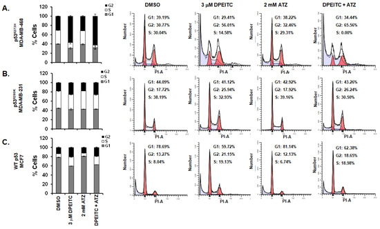 Effects of DPEITC and ATZ co-treatment on cell cycle progression in TNBC cell lines. p53R280K MDA-MB-231 (A), p53R273H MDA-MB-468 (B), and WT p53 MCF7 (C) cells were treated with DMSO, 3 μM DPEITC, 2 mM ATZ, or 3 μM DPEITC and 2 mM ATZ for 72 h and analyzed by flow cytometry. Experiments were performed in triplicate. Error bars represent SD. Representative cell cycle images are shown.