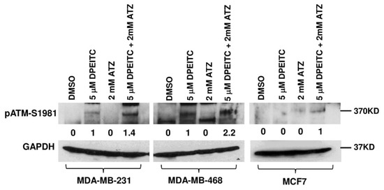 Effects of DPEITC and ATZ co-treatment on activation of ATM in mutant p53 TNBC cells. MDA-MB-231 (p53R280K), MDA-MB-468 (p53R273H), or MCF7 (WT p53) cells were treated with DMSO, 5 μM DPEITC, 2 mM ATZ, or both for 24 h. Blots were probed using the anti-pATM S1981 antibody and re-probed with the GAPDH antibody. Experiments were performed in triplicate.