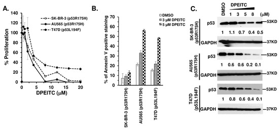 We next examined the effects of DPEITC on the proliferation of HER2+ (SK-BR-3, AU565) and Luminal A (T47D) breast cancer cell lines expressing a p53R175H or p53L194F structural mutant, respectively. In these cancer cells, DPEITC reduced cell proliferation at concentrations ≥ 12 µM after 24 h (Figure S7A), whereas, after 72 h, the IC50 value was 4 µM (Figure 5A). DPEITC (3 µM or 5 µM) enhanced the percentage of Annexin V stained SK-BR-3, AU565, and T47D cells compared to the DMSO-treated cells (bottom right quadrant shown in the representative flow cytometry image), respectively, after 72 h, suggesting that the compound induced apoptosis (Figure 5B and Figure S7B). Furthermore, DPEITC depleted p53R175H and p53L194F mutants in a dose-dependent manner (Figure 5C). We also showed that AU565 cells co-treated with DPEITC (3, 5, or 8 μM) and Nutlin-3 (10 μM) display a significant accumulation of p53R175H protein compared to cells treated with DPEITC alone (3, 5, or 8 μM, respectively) (Figure S7C).