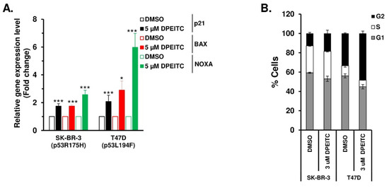 To determine if DPEITC restores WT functions to p53R175H and p53V194F mutants, we examined the expression of canonical p53 targets p21, BAX, and NOXA in SK-BR-3 and T47D cells, respectively, after treatment with 5 µM DPEITC. DPEITC upregulated expression of p21, BAX, and NOXA in SK-BR-3 and T47D cells (Figure 6A), demonstrating that DPEITC restores WT p53 transactivation functions to the p53 structural mutants in HER2+ and Luminal A breast cancer cells. Consistent with this idea, DPEITC induced G2/M phase arrest in p53R175H SK-BR-3 and p53V194F T47D cells (Figure 6B and Figure S8). Collectively, these results suggest that DPEITC rescues different mutant p53 types, contact and structural, irrespective of the breast cancer subtypes.