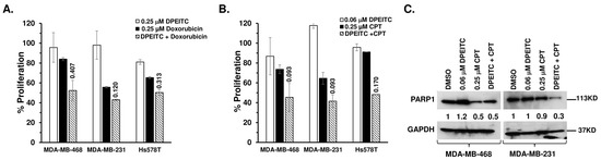 As a hallmark of apoptosis, caspase 3 induces the cleavage of PARP1 [31]. Therefore, to determine the apoptotic potential of combined treatment, we examined the effects of CPT (0.25 μM) and DPEITC (0.06 μM) on PARP1 levels in p53R280K MDA-MB-231 and p53R273H MDA-MB-468 cells. Western blot analysis showed a significant decrease in the levels of PARP1 in p53R280K MDA-MB-231 and p53R273H MDA-MB-468 cells co-treated with CPT (0.25 μM) and DPEITC (0.06 μM) compared to untreated control cells and cells treated with either agent alone (Figure 7C). These results demonstrate an apparent synergistic effect of DPEITC and CPT on apoptosis induction.