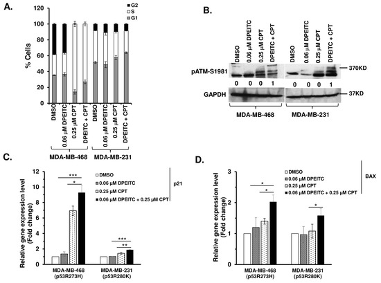 Effects of DPEITC and CPT co-treatment on cell cycle progression, activation of ATM, and canonical p53 targets. (A) MDA-MB-468 (p53R273H) or MDA-MB-231 (p53R280K) cells were treated with DPEITC, CPT, or both for 24 h and analyzed by flow cytometry. (B) MDA-MB-468 (p53R273H) or MDA-MB-231 (p53R280K) cells were treated with DPEITC, CPT, or both for 24 h. Blots were probed using the anti-pATM S1981 antibody and re-probed with the GAPDH antibody. (C) and (D) The expression of canonical p53 target genes p21 (C) and BAX (D) in MDA-MB-468 (p53R273H) or MDA-MB-231 (p53R280K) cells treated with DPEITC, CPT, or both for 24 h were analyzed by qRT-PCR. The p-values are as indicated (*** p ≤ 0.0005, ** p ≤ 0.005 and * p ≤ 0.05). Experiments were performed in triplicate. Error bars represent the SD.