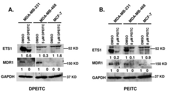 Energy-dependent drug efflux by ABC-transporters, including ABCB1/MDR1 (multi-drug resistance 1)/P-glycoprotein (P-gp), constitutes one of the best-characterized mechanisms of multi-drug resistance in vitro [32]. As a GOF activity, mutant p53 protein selectively upregulates the expression of MDR1 via its interaction with a transcription factor ETS1 [33]. In contrast, WT p53 does not interact with ETS1 and abolishes MDR1 activity [6,32,33,34]. Because DPEITC rescued mutant p53, we examined whether the reactivation of p53R280K and p53R273H to ‘WT-like’ p53 abolishes its ability to upregulate the expression of ETS1 and MDR1 in MDA-MB-231 and MDA-MB-468 cells, respectively. Therefore, we examined the expression of ETS1 and MDR1 in MDA-MB-231 and MDA-MB-468 cells treated with DPEITC. Western blot analysis of MDA-MB-231 and MDA-MB-468 cells treated with DPEITC (5 μM) revealed a significant decrease in the expression of ETS1 and MDR1 when compared with DMSO-treated cells (Figure 9A). No significant change in the expression of ETS1 and MDR1 was observed in the WT p53 MCF7 cells that were untreated or treated with DPEITC (Figure 9A). Previously, we found that dietary-related PEITC rescues mutant p53 [20,21]. As a control, we showed that PEITC treatment reduced the expression of ETS1 and MDR1 in mutant p53 MDA-MB-231 and MDA-MB-468 but not WT p53 MCF7 cells (Figure 9B). These results suggest that restoration of ‘WT-like’ p53 functions to mutant p53 by an ITC, synthetic or naturally occurring dietary-related, could abolish mutant p53 GOF activity to induce upregulation of MDR1 expression in cancer cells.