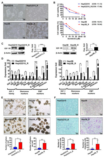 3.1. Sorafenib-Resistant HCC Cells Exhibited Higher IGF-1R Expression Levels and Stronger Stemness/EMT-Related Properties