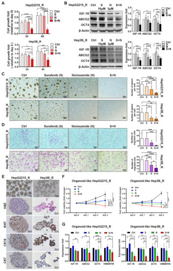 3.2. Niclosamide Significantly Enhanced the Sorafenib Sensitivity (as Indicated by Cell Viability) and Suppressed the Stemness-Related Properties of Sorafenib-Resistant HCC Cells