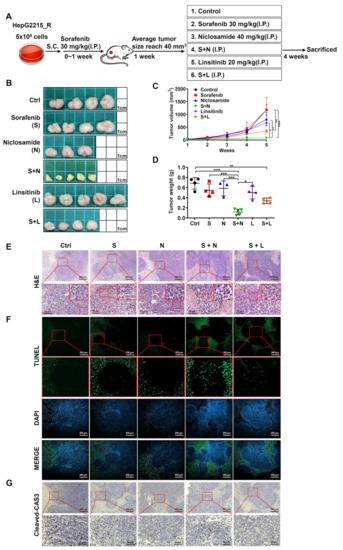 3.7. The Combination of Niclosamide and Sorafenib Suppressed Tumor Growth by Increasing the Cell Apoptosis in Sorafenib-Resistant HCC Cells In Vivo