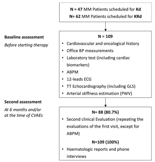 - Bruno, G.; Bringhen, S.; Maffei, I.; Iannaccone, A.; Crea, T.; Ravera, A.; Astarita, A.; Vallelonga, F.; Salvini, M.; Gay, F.; et al. Cardiovascular Organ Damage and Blood Pressure Levels Predict Adverse Events in Multiple Myeloma Patients Undergoing Carfilzomib Therapy. Cancers 2019, 11, 622. [Google Scholar] [CrossRef]