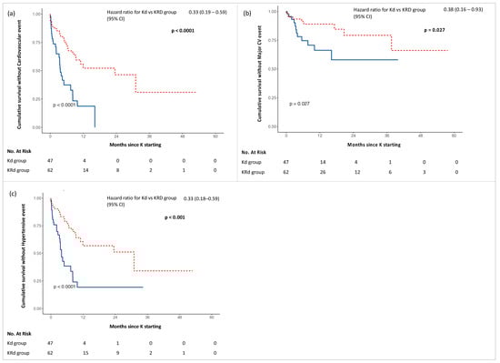 Kaplan–Meier curves for adverse events in Kd (blue) and KRd (red) groups: (a) Cumulative survival without Cardiovascular event; (b) Cumulative survival without Major CV event; (c) Cumulative survival without Hypertensive event.