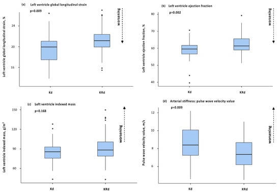 Box plots of main parameters of organ damage at second visit between Kd and KRd: (a) left ventricle global longitudinal strain; (b) left ventricle ejection fraction; (c) left ventricle indexed mass; (d) pulse wave velocity.