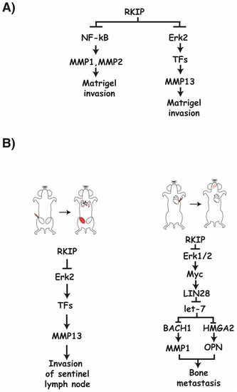 (A) A schematic summary of signaling pathways that are targeted by RKIP to regulate the indicated MMP expression in vitro. (B) Cartoons showing two different cancer transplantation models used to identify signaling pathways targeted by RKIP to regulate MMP expression in vivo.