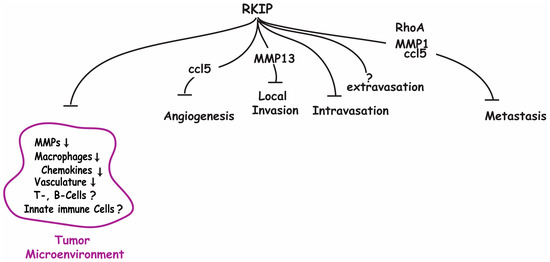 A schematic summary of the causal role of RKIP on the expression and effects of several proteins known to modulate the TME, and the metastasis cascade.