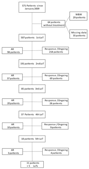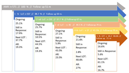 Consort Diagram. The number of patients from the beginning to the 5th line of therapy (LoT) is presented. The attrition rate (AR) is given on the left side of the diagram. Patients under treatment (ongoing) or without treatment but still in response (response) are listed on the right side for each LoT. The number of patients who have entered the subsequent LoT are displayed under each LoT.