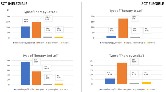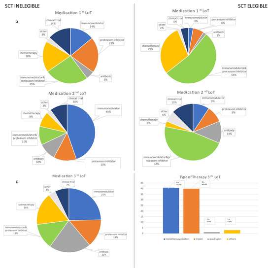 This figure presents (a) the type of therapy in the first line of therapy (LoT) and the second LoT. The type of therapy is divided into monotherapy and doublet, triplet, quadruplet or other regimens. The second figure (b) shows the type of medication in the first and second LoT. The medications are classified into the following groups: immunomodulators, proteasome inhibitors, Ps and proteasome inhibitors, chemotherapy, antibody, clinical trial, or others. In (a,b), patients are categorized into two groups: those eligible for transplantation (SCT Eligible) and those ineligible for SCT (SCT Ineligible). In the last figure (c), the type of medication and therapy is given for all patients in the third LoT as one group due to the limited number of patients.