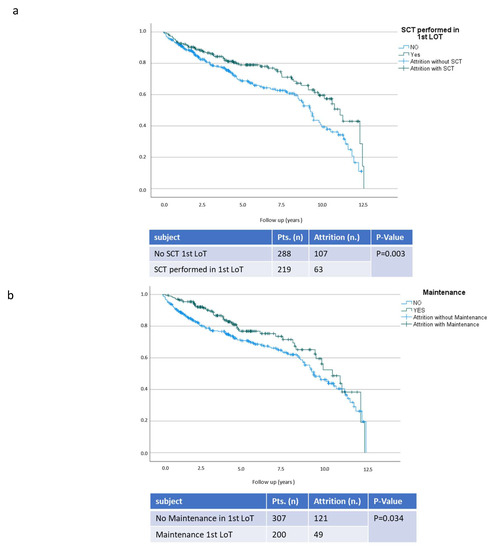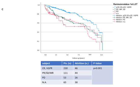 High-risk cytogenetic features included hypodiploid karyotypes, translocation t(4;14), translocation t(14;16), deletion del(17p) and amplification 1q of copy numbers. Initial performance status in line with WHO criteria was assessed at the beginning and end of treatments, while ECOG scores were assessed at the first diagnosis. For each LoT, remission status, best response and the attrition rate were recorded. Deceased patients and patients “lost to follow-up” were included in the attrition cohort. Patients without any documentation ≥ 5 years in the registry were identified as “lost to follow-up”. Patients with progressive disease without any additional LoT were likewise added to the AR cohort.