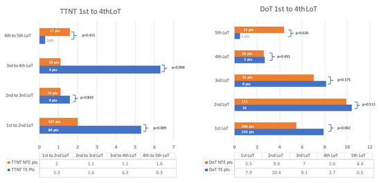 The DoT decreased continuously with a median of 6.7 (3.8–13.6) months in LoT-1 to 4 (0.5–7.3) months in LoT-5. The exception was the second LoT. This can be explained by the higher amount of patients still on treatment in the first LoT with a consecutively lower transition to the second LoT. TTNT decreased similarly with 3.8 (0.9–16.2) months in the first LoT compared to 1.5 (0.3–3.4 m) months in the fourth LoT. The course of DoT and TTNT is presented in Figure 5.