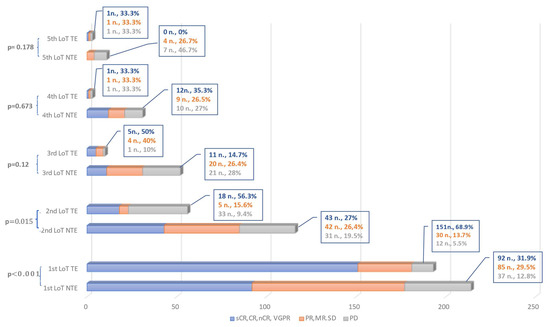 Depiction of the achieved depth of remission from the first to the fifth line of therapy (LoT). For coherence, the remission status has been categorized as very good partial response (VGPR) or better in one group and stable disease (SD), minimal response (MR) and partial response (PR) in another group. Progressive disease (PD) is listed separately. The difference between transplant-eligible (TE) and transplant-ineligible (NTE) patients is displayed for each LoT. On the right side, the number of patients and the percentage of each group is given in the same color as in the graph. The p-value on the left side indicates the significance in chi-square testing between TE and NTE patients.