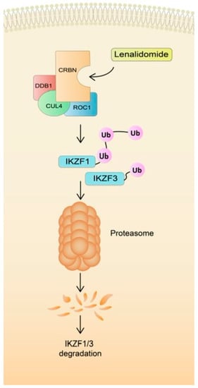 - Krönke, J.; Udeshi, N.D.; Narla, A.; Grauman, P.; Hurst, S.N.; McConkey, M.; Svinkina, T.; Heckl, D.; Comer, E.; Li, X.; et al. Lenalidomide Causes Selective Degradation IKZF1IKZF3 Multiple Myeloma Cells. Science 2014, 343, 301–305. [Google Scholar] [CrossRef]