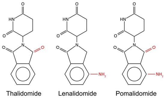 IMiDs are derivatives of THAL. Therefore, they exhibit a similar mechanism of action, i.e., binding to CRBN elicits their downstream activity, overlapping toxicity profile, as well as shares some adverse reactions. In addition, all molecules have a similar chemical structure. However, there are subtle but important differences between these three agents. All three representatives of IMiDs have a mutual phthalimide and glutarimide carbon skeleton and are distinguished only by the side chain; more precisely, by the carboxyl and amino groups (Figure 2) [25].