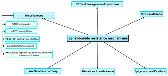 Drug resistance is one of the greatest challenges of modern oncology and has become the main reason for treatment failure in cancer. It is estimated that approximately 90% of cancer-related deaths occur as a consequence of drug resistance [10]. Resistance mechanisms can be categorized into intrinsic or extrinsic classes. Intrinsic mechanisms are based on cellular properties, while extrinsic resistance develops during cancer treatment despite primary sensitivity to applied agents [11]. Cellular resistance appears to be mediated by promoted efflux, reduced influx or induction of apoptosis [12]. The activation of alternative signaling pathways and elevated expression of therapeutic targets contribute to extrinsic drug resistance [13]. Anticancer agents eliminate malignant cells. However, at the same time, they exert tremendous environmental pressure on them, eventually leading to the selection of resistant clones. The aim of this review is to shed more light on the pathophysiology of LEN resistance in MM, with particular emphasis on the molecular background, as well as current and possible future strategies for overcoming LEN resistance. Moreover, we have briefly summarized current approaches to the treatment of LEN-resistant MM as well as outlined the future directions.
