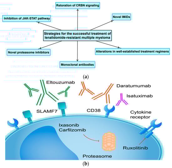 (a) The most important treatment strategies and future perspectives for the successful treatment LEN-resistant MM. (b) Molecular targets for novel agents successfully implemented in the treatment of RRMM.