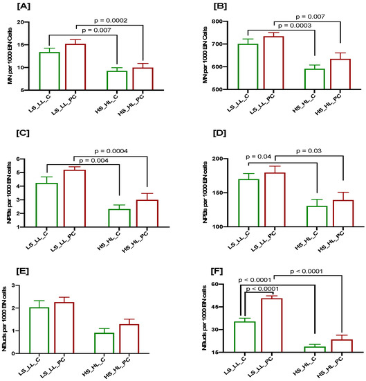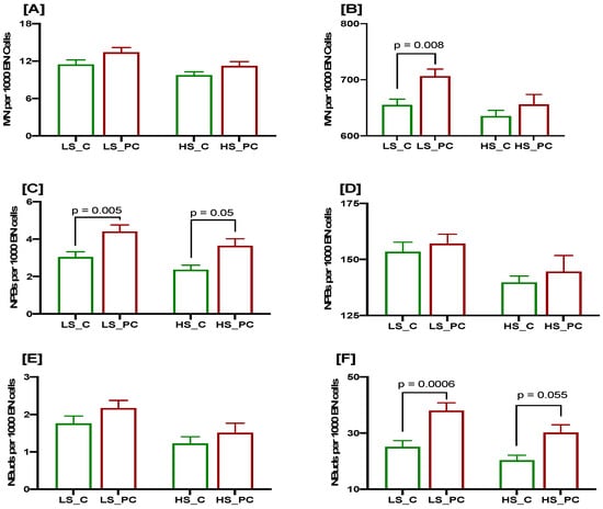 CBMN Cytome assay biomarkers in PC patients (red bars) and age-matched healthy control (green bars) stratified as per selenium and lycopene concentrations (LS: low selenium; HS: high selenium; LL: low lycopene; HL: high lycopene); MN frequency at baseline (A) and after 3 Gy irradiation (B); NPBs at baseline (C) and after 3 Gy irradiation (D); NBuds at baseline (E) and after 3 Gy irradiation (F). N = 29, 34, 52 and 28, respectively, from left to right for each bar. p values are only indicated for those comparisons that are significant.