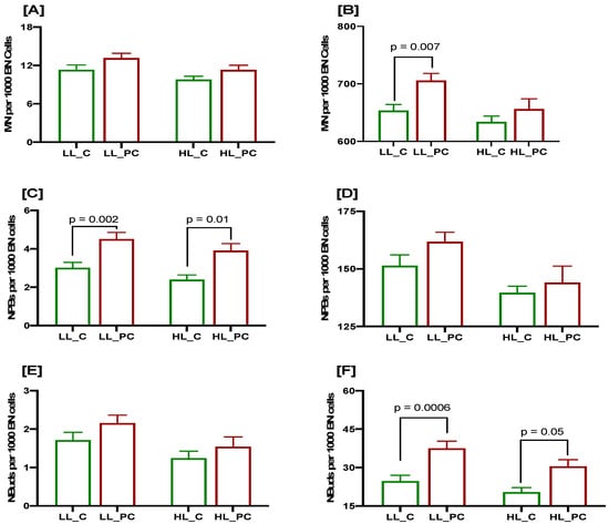 CBMN Cytome assay biomarkers in PC patients (red bars) and age-matched healthy controls (green bars) stratified as per lycopene concentration (LL: low lycopene; HL: high lycopene); MN frequency at baseline (A) and after 3 Gy irradiation (B); NPBs at baseline (C) and after 3 Gy irradiation (D); NBuds at baseline (E) and after 3 Gy irradiation (F). N = 61, 67, 71 and 36, respectively, from left to right for each bar. p values are only indicated for those comparisons that are significant.
