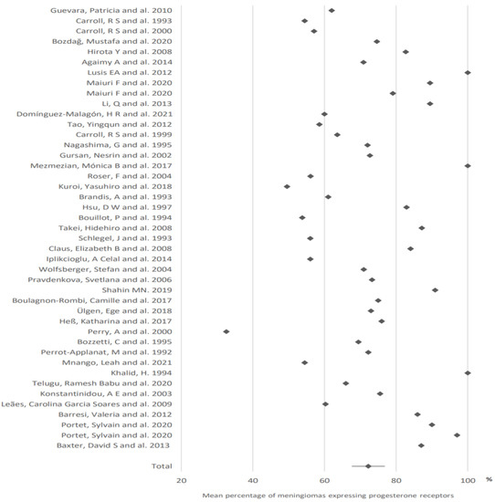 72.2% of meningiomas expressed progesterone receptors (95% CI: 67.6–76.8). This value was calculated from the data of 43 articles (Figure 1).