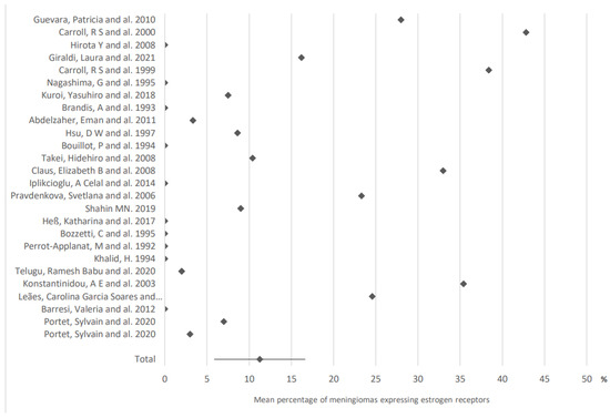 Twenty-six articles allowed the study of the expression of estrogen receptors in meningiomas (Figure 2): these receptors were expressed in 11.3% of cases (95% CI: 5.9–16.7).