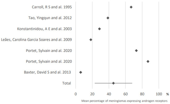 Finally, androgen receptors were expressed in 72.1% of meningiomas developed in women (95% CI: 48.8–95.4) and in 50.6% of meningiomas developed in men (95% CI: 37.5–63.7). Data were based on the analysis of four and three articles, respectively.
