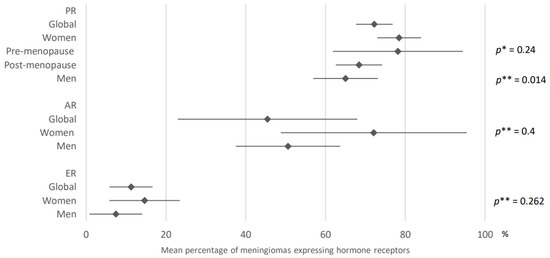 Comparison of hormone receptors expression in meningiomas according to gender. PR: progesterone receptors; AR: androgen receptors; ER: estrogen receptors. The results are expressed as a mean associated with their 95% confidence interval. p*: pre-menopause versus post-menopause, p**: men versus women. Number of articles analyzed related to the topic: Progesterone receptors: Women: 32; Pre-menopause: 6, Post-menopause: 2, Men: 25; Androgen receptors: Women: 4, Men: 3; Estrogen receptors: Women: 20, Men: 16; Number of included cases (total for all studies; minimum; maximum in each study): Progesterone receptors: Women, 1940 (8; 396); Pre-menopause, 160 (10; 68); Post-menopause, 33 (7; 26); Men, 747 (3; 192); Androgen receptors: Women, 438 (21; 357); Men, 105 (1; 86); Estrogen receptors: Women, 1036 (15; 357); Men, 341 (1; 86).
