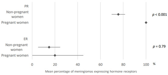 Comparison of hormone receptors expression within meningiomas developed in pregnant versus non-pregnant women. PR: progesterone receptors; ER: estrogen receptors. The results are expressed as a mean associated with their 95% confidence interval. Number of articles analyzed related to the topic: Progesterone receptors: Non-pregnant women: 27; Pregnant women: 5; Estrogen receptors: Non-pregnant women: 18; Pregnant women: 5; Number of cases analyzed expressed as total number of cases included (minimum number; maximum number): Progesterone receptors: Non-pregnant Women: 1940 (8; 396); Pregnant-Women: 27 (1; 17); Estrogen receptors: Non-pregnant Women: 1036 (15; 357); Pregnant-Women: 53 (1; 29).