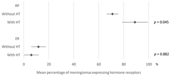 Comparison of hormone receptors expression in meningiomas developed under hormonal treatment versus without. PR: progesterone receptors; ER: estrogen receptors; HT: hormonal treatment. The results are expressed as a mean associated with their 95% confidence interval. Number of articles analyzed related to the topic: Progesterone receptors: without HT: 41; with HT: 3; Estrogen receptors: without HT: 24; with HT: 2. Number of included cases (total for all studies; minimum; maximum in each study): Progesterone receptors: without HT, 3838 (11; 588); with HT, 80 (24; 30); Estrogen receptors: without HT, 1472 (21; 161); with HT, 56 (26; 30).