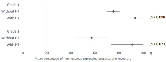 Comparison of progesterone receptors expression in meningiomas developed under and without hormonal treatment according to grade. HT: hormonal treatment. The results are expressed as a mean associated with their 95% confidence interval. Number of articles analyzed related to the topic: Grade 1: Without HT: 24; With HT: 2; Grade 2: Without HT: 15; With HT: 2; Number of cases analyzed expressed as total number of cases included (minimum number; maximum number): Grade 1: Without HT: 2500 (5; 533); With HT: 38 (11; 27); Grade 2: Without HT: 297 (2; 60); With HT: 6 (3).