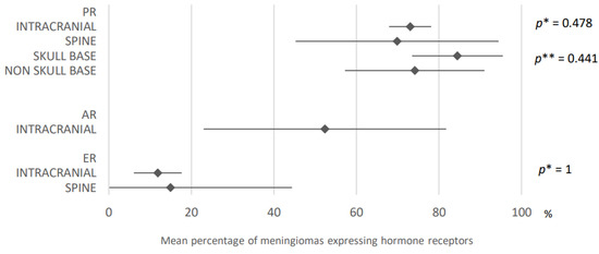 Comparison of hormone receptors expression in meningiomas according to their location. PR: progesterone receptors; AR: androgen receptors; ER: estrogen receptors. The results are expressed as a mean associated with their 95% confidence interval. p*: intracranial versus spine; p**: skull base versus non skull base. Number of articles analyzed related to the topic: Progesterone receptors: Intracranial: 36; Spine: 7; Skull base: 10; Non-skull base: 8; Androgen receptors: Intracranial: 5; Estrogen receptors: Intracranial: 24; Spine: 2; Number of included cases (total for all studies; minimum; maximum in each study): Progesterone receptors: Intracranial, 2685 (11; 588); Spine, 119 (1; 58); Skull base, 383 (4; 208); Non-skull base, 244 (7; 100); Androgen receptors: Intracranial, 246 (30; 96); Estrogen receptors: Intracranial, 1285 (11; 161); Spine, 34 (4; 30).