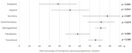 Comparison of progesterone receptors expression in meningiomas according to histological subtype. The results are expressed as a mean associated with their 95% confidence interval. p: meningothelial versus another histological subtype. Number of analyzed articles related to the topic: Anaplastic: 18; Atypical: 15; Secretory: 8; Psammomatous: 8; Meningothelial: 23 Fibroblastic: 20; Transitional: 22. Number of included cases (total for all studies; minimum; maximum in each study): Anaplastic, 57 (1; 7); Atypical, 50 (1; 10); Secretory, 69 (1; 31); Psammomatous, 81 (4; 28); Meningothelial: 935, (5; 376); Fibroblastic, 257 (1; 77); Transitional, 402 (3; 61).
