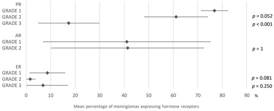 Comparison of hormone receptors expression in meningiomas according to grade. PR: progesterone receptors; AR: androgen receptors; ER: estrogen receptors. The results are expressed as a mean associated with their 95% confidence interval. p: grade 1 versus grade 2 or 3. Number of articles analyzed related to the topic: Progesterone receptors: Grade 1: 26; Grade 2: 17; Grade 3: 14; Androgen receptors: Grade 1: 4; Grade 2: 3; Estrogen receptors: Grade 1: 15; Grade 2: 10; Grade 3: 8. Number of included cases (total for all studies; minimum; maximum in each study): Progesterone receptors: Grade 1, 2538 (5; 533); Grade 2, 303 (3; 60); Grade 3, 164 (1; 87); Androgen receptors: Grade 1, 607 (27; 444); Grade 2, 53 (3; 39); Estrogen receptors: Grade 1, 1150 (11; 444); Grade 2, 154 (3; 60); Grade 3, 129 (1; 87).