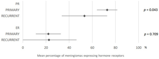 Comparison of hormone receptors expression in meningiomas according to their primary or recurrent nature. PR: progesterone receptors; ER: estrogen receptors. The results are expressed as a mean associated with their 95% confidence interval. Number of articles analyzed related to the topic: Progesterone receptors: Primary: 11; Recurrent: 9; Estrogen receptors: Primary: 8; Recurrent: 8. Number of included cases (total for all studies; minimum; maximum in each study): Progesterone receptors: Primary, 1839 (21; 588); Recurrent, 268 (1; 97); Estrogen receptors: Primary, 928 (21; 510); Recurrent, 153 (1; 67).