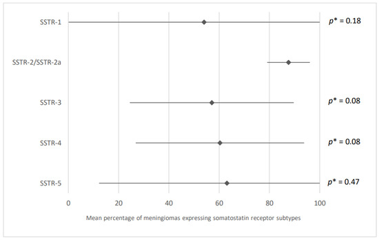 Expression of different somatostatin receptor subtypes in meningiomas. The results are expressed as a mean associated with their 95% confidence interval. SSTR: somatostatin receptor. p*: subtype SSTR-2/SSTR-2a versus other subtypes. Number of articles analyzed related to the topic for each respective subtype: 3, 8, 3, 3, 3. Number of included cases (total for all studies; minimum; maximum in each study): SSTR-1/SSTR-3/SSTR-4/SSTR-5: 826 (40; 726); SSTR-2/SSTR-2a: 1122 (4; 726).