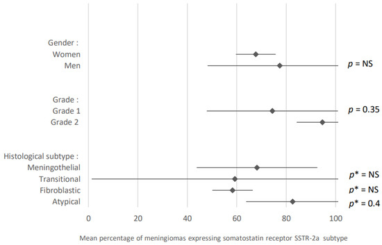 Comparison of somatostatin receptor SSTR-2a subtype expression in meningiomas according to different parameters. The results are expressed as a mean associated with their 95% confidence interval. p*: meningothelial subtype versus other subtypes. NS: not significant. Number of articles analyzed related to the topic for each parameter: Gender: 2; Grade: 3; Histological subtype: 3. Number of included cases (total for all studies; minimum; maximum in each study): Gender: Women, 54 (22; 32)/Men, 21 (8; 13); Grade: Grade 1, 99 (13; 47)/Grade 2, 31 (1; 19) Histological subtype: Meningothelial, 47 (7; 29)/Transitional, 27 (1; 16) / Fibroblastic, 26 (2; 16); Atypical, 29 (3; 16).
