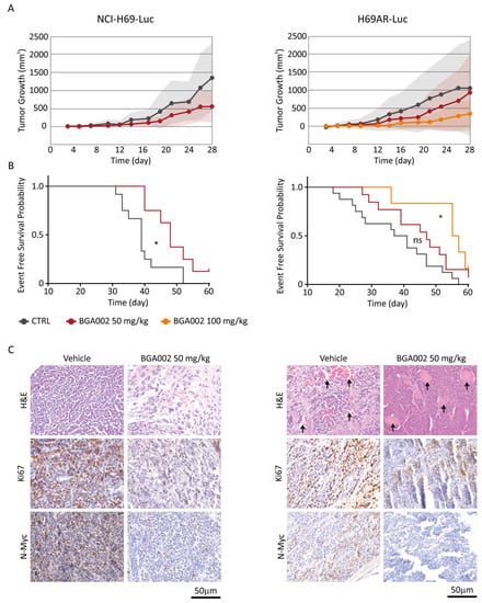 Finally, we evaluated the in vivo antitumor activity of BGA002 in two different xenograft models of MNA-SCLC: NCI-H69-Luc and multidrug-resistant H69AR-Luc. The systemic administration (subcutaneously (SC), daily for 28 days) of BGA002 was able to reduce tumor growth in comparison to the vehicle in both models (Figure 5A).
