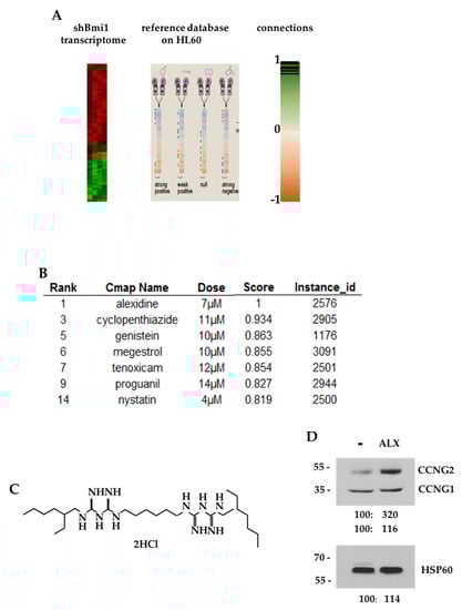 We interrogated the Connectivity Map signature database with a gene expression profile of BMI1-silenced K562 cells and searched for molecules that could mimic BMI1 silencing at the gene expression level, restricting our analysis to signatures obtained by perturbagens acting on HL-60 leukemic cells that were closest to the K562 model (Figure 1A). The highest score was obtained for alexidine (ALX) (Figure 1B)—an alkyl-(bis)-biguanide molecule, the structure of which is shown in Figure 1C. We then verified that ALX could reproduce some functional effects observed after BMI1 extinction and, indeed, we could observe that ALX stimulated the expression of the CCNG2 protein without changing that of the CCNG1 protein in K562 cells (Figure 1D).