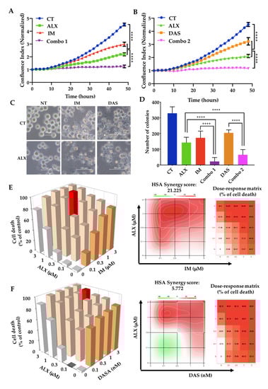 We then observed that ALX combined with IM inhibited K562 cells’ proliferation by 95%, in contrast to 50% and 70% for IM and ALX alone, respectively (Figure 2A). Similar effects were also noted when combining ALX with dasatinib (DAS) (Figure 2B). The combination of ALX and IM was also effective on a second CML line: LAMA-84 (Figure S1). A phase-contrast microscopy analysis of K562 cells showed that ALX, IM, or DAS decreased cell numbers after 48 h of treatment, and more pronounced effects when ALX was added with IM or DAS (Figure 2C). ALX affected the clonogenicity of K562 cells (Figure 2D) in a similar range to IM or DAS, and the combination of ALX with either of these two TKIs completely inhibited colony formation. ALX had similar effects on the LAMA-84 cell line (Figures S2 and S3). We next evaluated the synergistic effects of each combination using the SynergyFinder software. The majority of combinations of ALX with IM or DAS produced several highly synergistic results, with HSA synergy scores of 21.225 for IM/ALX in K562 cells (Figure 2E) and 19.147 in LAMA-84 cells (Figure S4). The DAS/ALX combination in K562 cells gave synergistic results with an HSA synergy score of 5.772 (Figure 2F). Individual synergy score calculation allowed us to identify the best synergy combinations as 1 μM ALX/1 μM IM (Figure 2E, red columns in histograms) and 1 μM ALX/3 nM DAS (Figure 2F, red columns in histograms) in K562 cells. Moreover, we also observed that ALX strongly synergized with the other TKIs—nilotinib (NILO), bosutinib (BOSU), and ponatinib (PONA)—to induce cell death, with HSA scores of about 20 on K562 cells (Figure S5).
