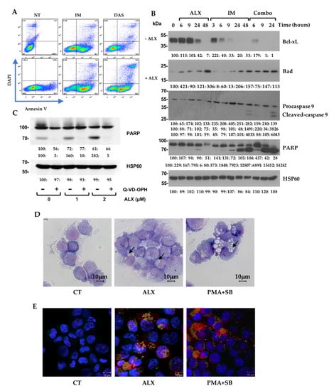Combinations of ALX and imatinib induced apoptotic and autophagic events in K562 cells: (A) K562 cells were stimulated or not with 1 µM alexidine (ALX) alone or in combination with 1 µM imatinib (IM) for 24 h. Cytometry analysis after annexin V/DAPI labeling (left panel). Histograms for annexin V+ DAPI+ cells (top-right panel) and annexin V+ DAPI− cells (bottom-right panel); (B) K562 cells were stimulated or not with 1 µM alexidine (ALX), 1 µM imatinib (IM), or their combination (Combo) for the indicated times. Expression of the mentioned proteins was visualized by immunoblotting. (C) K562 cells were incubated for 45 min in the presence or absence of 30 μM Q-VD-OPH before being stimulated 24 h with the indicated concentration of alexidine (ALX). Cell lysates were analyzed by immunoblotting for the indicated proteins. (D) K562 cells were incubated for 24 h with DMSO (CT), 1 µM alexidine (ALX), or a combination of PMA and SB202190 (PMA + SB). The visualization of vacuolization (arrows) was performed after MGG staining on Cytospin-fixated cells. (E) K562 cells stably expressing RFP-LC3 were stimulated for 24 h with DMSO (CT), 1 µM alexidine (ALX), or a combination of PMA and SB202190 (PMA + SB). Cells were analyzed using a confocal microscope. DAPI was used to visualize the nuclei.