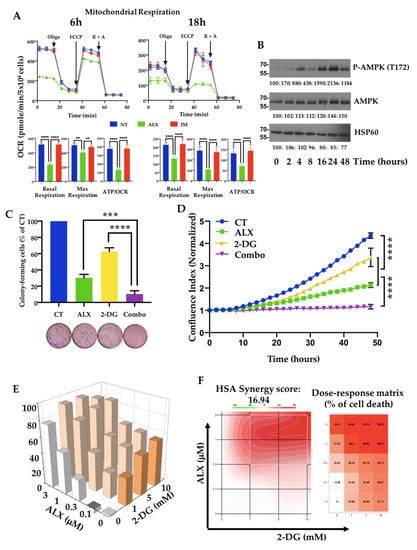 The facts that biguanides such as metformin are known to affect mitochondrial respiration and that ALX targets the mitochondrial PTPMT1 phosphatase, which is known to regulate mitochondrial respiration, led us to analyze the effects of the bis-biguanide ALX on this energetic parameter and on ATP production. Using a Seahorse metabolic analyzer, we observed that basal respiration and ATP production along with OCR were inhibited as early as 6 h into treatment with 1 μM ALX, and maximal respiration was reduced by 80% after 18 h of treatment (Figure 4A). No change in mitochondrial respiration could be detected in the presence of 1 μM IM. The decrease in OCR-linked ATP production in ALX-treated leukemia cells led us to examine the phosphorylation status of the ATP sensor AMPK under these conditions. A time-course exposure of K562 cells to 1 μM ALX showed increasing phosphorylation of AMPK on threonine 172, with a maximum reached after 24 h of treatment, correlating well with the kinetics of ATP production (Figure 4B). We observed that ALX did not affect BMI1 expression but increased CCNG2 expression and totally inhibited the expression of its target, PTPMT1 (Figure S8). IM induced a decrease in BMI1 expression that correlated with a re-expression of CCNG2, but it did not modify PTPMT1 expression. We then associated the inhibition of the mitochondrial respiratory chain by ALX with a blockade of glycolysis by 2-deoxyglucose (2-DG). We first observed that 1 μM ALX together with 10 mM 2-DG drastically decreased both the clonogenic potential (Figure 4C) and the proliferation (Figure 4D) of K562 cells by 90%, while 2-DG alone only inhibited these two parameters by 20%. We performed cross-dosing of ALX and 2-DG for 48 h, quantified cell death by DAPI incorporation followed by flow cytometry (Figure 4E), and calculated the cell death synergies (Figure 4F). We observed that ALX synergized strongly with 2-DG, especially with ALX doses above 0.3 μM.