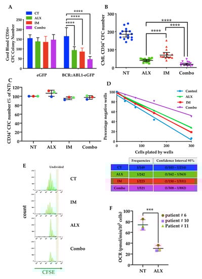 We first evaluated the effect of ALX on the differentiation of primary CD34+ cells derived from human cord blood (Figure S9). The dose response of ALX established the safety of ALX for concentrations below 3 μM, and we selected a dose of 1 μM for the subsequent ex vivo experiments. To evaluate the specificity of ALX’s action on leukemic vs. normal cells, we transduced umbilical cord CD34+ cells with a lentiviral vector encoding the BCR::ABL1 oncogene. As shown in Figure 5A, ALX selectively inhibited the clonogenicity of BCR::ABL1 -transduced CD34+ cells similarly to IM, and the combination of the two molecules further increased the inhibitory effect compared to the effect of each of these drugs used alone. We next used bone marrow samples from a cohort of 15 diagnosed CML patients, to assess the impact of ALX alone or in combination with IM on the clonogenic potential of primary CML CD34+ cells. The addition of 1 μM IM led to a mean 60% decrease in the clonogenicity of CML CD34+ cells, whereas 1 μM ALX decreased their clonogenic potential by approximately 70%, with a more homogeneous response compared to IM (Figure 5B). The combination of the two drugs amplified the response, with only 10% of colonies remaining (Figure 5B). Under the same conditions, neither ALX, nor IM, nor their combination affected CD34+ cells from healthy donors, showing their safety for normal cells (Figure 5C). Similar results were obtained by combining ALX with a second- (i.e., nilotinib, dasatinib, or bosutinib) or a third-generation (i.e., ponatinib) TKI (Figure S10). LTC-IC experiments with LDA showed the impact of these treatments on the leukemic progenitor/stem compartment. IM and ALX alone induced a moderate reduction in the frequency of CML stem/progenitor cells, by 1.4- and 1.56-fold, respectively, whereas the combination of the two molecules was very effective in reducing this frequency (3.3-fold) (Figure 5D). Primary CML CD34+ cells were then labeled with the fluorescent cell division tracker CFSE. In the absence of cytokines, the combination of ALX and IM drastically abrogated their proliferation, while the addition of IM or ALX alone only partially decreased the number of dividing CD34+ cells. Cells with the highest CFSE staining corresponding to undivided and most primitive leukemic stem/progenitor cells were eliminated by the ALX/IM combo, while each molecule alone had only modest effects (Figure 5E). Interestingly, we observed that ALX exhibited a strong ability to reduce mitochondrial respiration in primary CD34+ CML patient cells (Figure 5F).