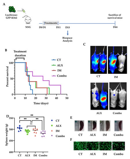 Combination of alexidine and imatinib increased leukemic mice’s survival. (A) Schematic design of the in vivo experiment. NSG mice (7 per group) were injected intravenously with GFP-K562-transduced cells. One day later, the mice were treated daily for 10 days with intraperitoneal injection of PBS (CT), 45 mg/kg imatinib (IM), 0.5 mg/kg of alexidine (ALX) or a combination (Combo). The last surviving mice were euthanatized at day 44. (B) Survival curves of mice according to the different treatments. (C) Two representative images of Biospace analysis of each indicated group of treated mice at day 15. (D) Quantification of the spleen weight of all mice in each group (unit = g); ** p < 0.01, 2-way ANOVA. (E) Photographs representing spleens of mice from each group that died between days 12 and 17. (F) GFP cell contents of the spleens presented in (E).