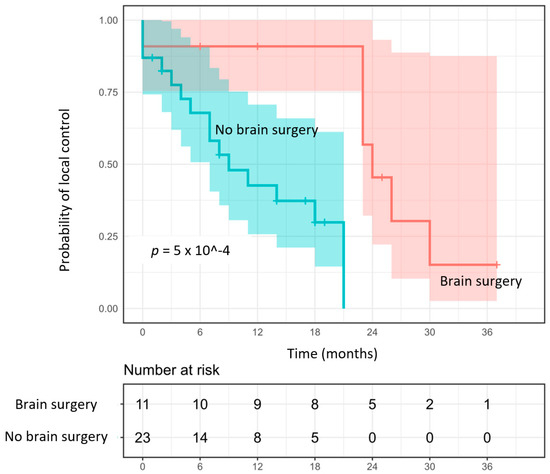 With a median follow-up study of 12 months (range: 1–37 months), the crude local control was 68%, with the 1- and 2-year local control rates being at 60% and 25%, respectively (Figure 1). In the univariate analysis, NSCLC histology (p = 0.005) and a lack of surgery (p < 0.0001) (Figure 1) were associated with worse LC; however, only the lack of surgery before SRT2 was predictive of local failure in the multivariate analysis (p = 0.002; HR 12.8, 95% CI: 1.5–110.0) (Table 3). The 1-year local control rates varied depending on the histology with the rates of 80%, 63%, and 38% for melanoma (n = 5), breast carcinoma (n = 6), and NSCLC (n = 16) metastases, respectively. No other factors, including neither the volume of metastases at the time of SRT2 nor the interval between the first and the second courses of SRT, were significantly predictive of local control.